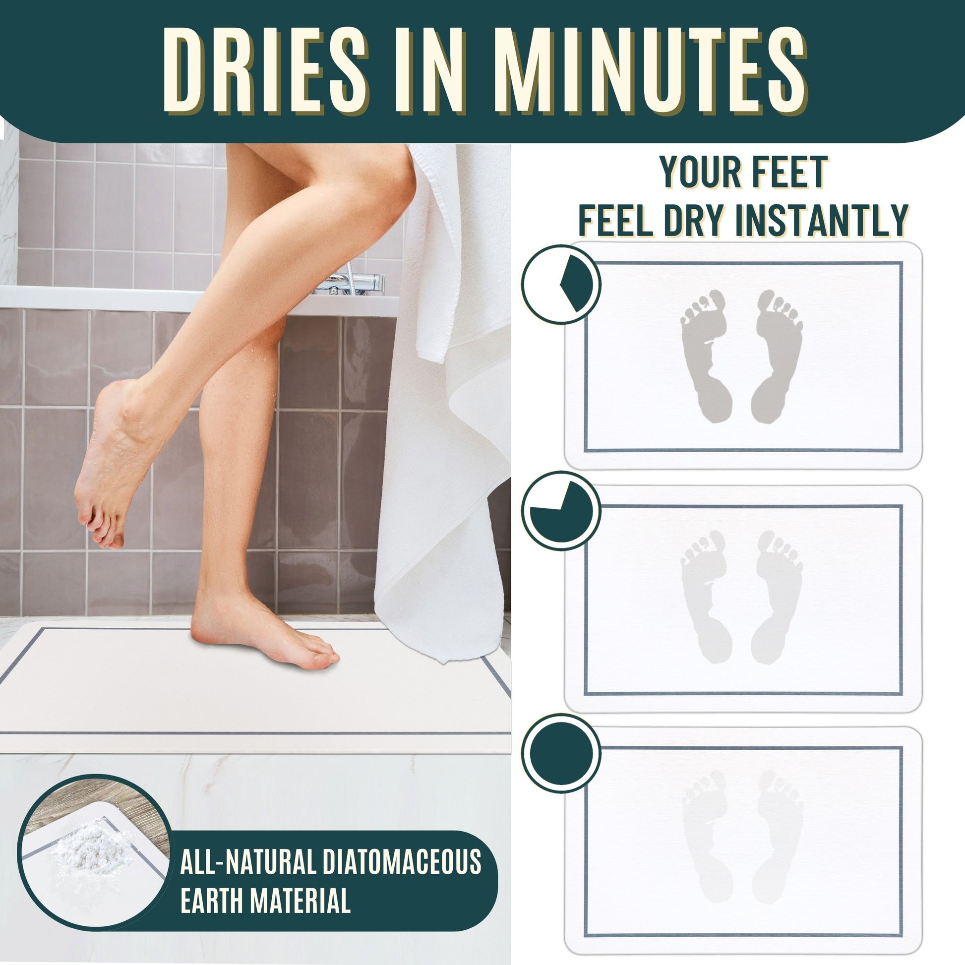 - A: Your feet will feel dry instantly, and the mat will absorb any water in minutes, keeping your bathroom floor dry and fresh. The mat will stay 'wet-colored' while it evaporates the water it absorbed, and will then return to its natural color.